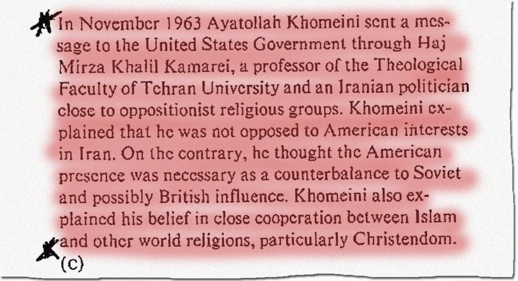 The 1980 CIA study says “in November 1963 Ayatollah Khomeini sent a message to the United States Government through [Tehran University professor] Haj Mirza Khalil Kamarei”, in which he explained “that he was not opposed to American interests in Iran” and that “on the contrary, he thought the American presence was necessary as a counterbalance to Soviet and possibly British influence”. Iranian leaders have vehemently denied that Khomeini ever sent such a message.