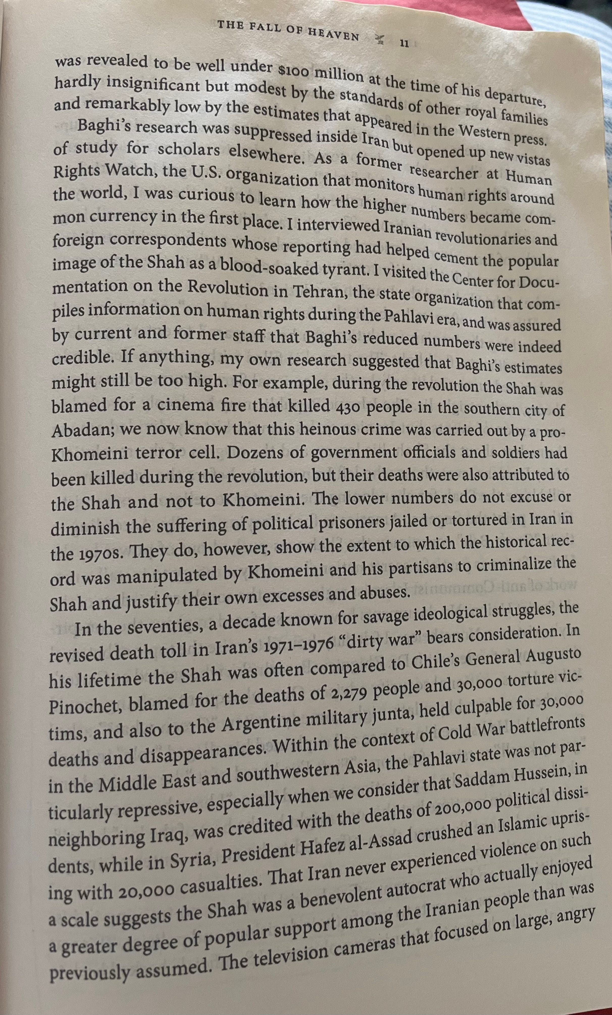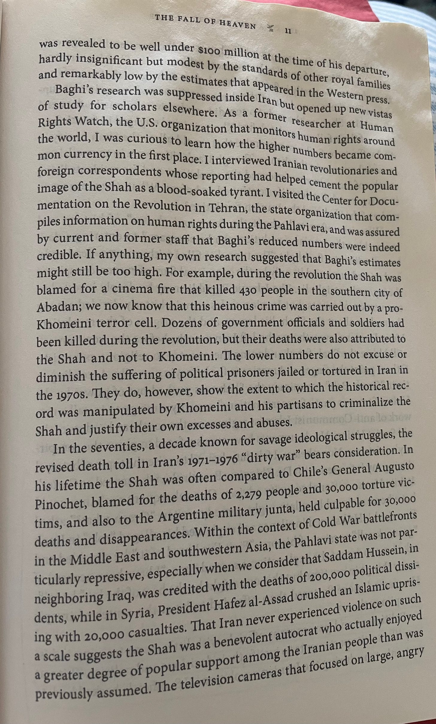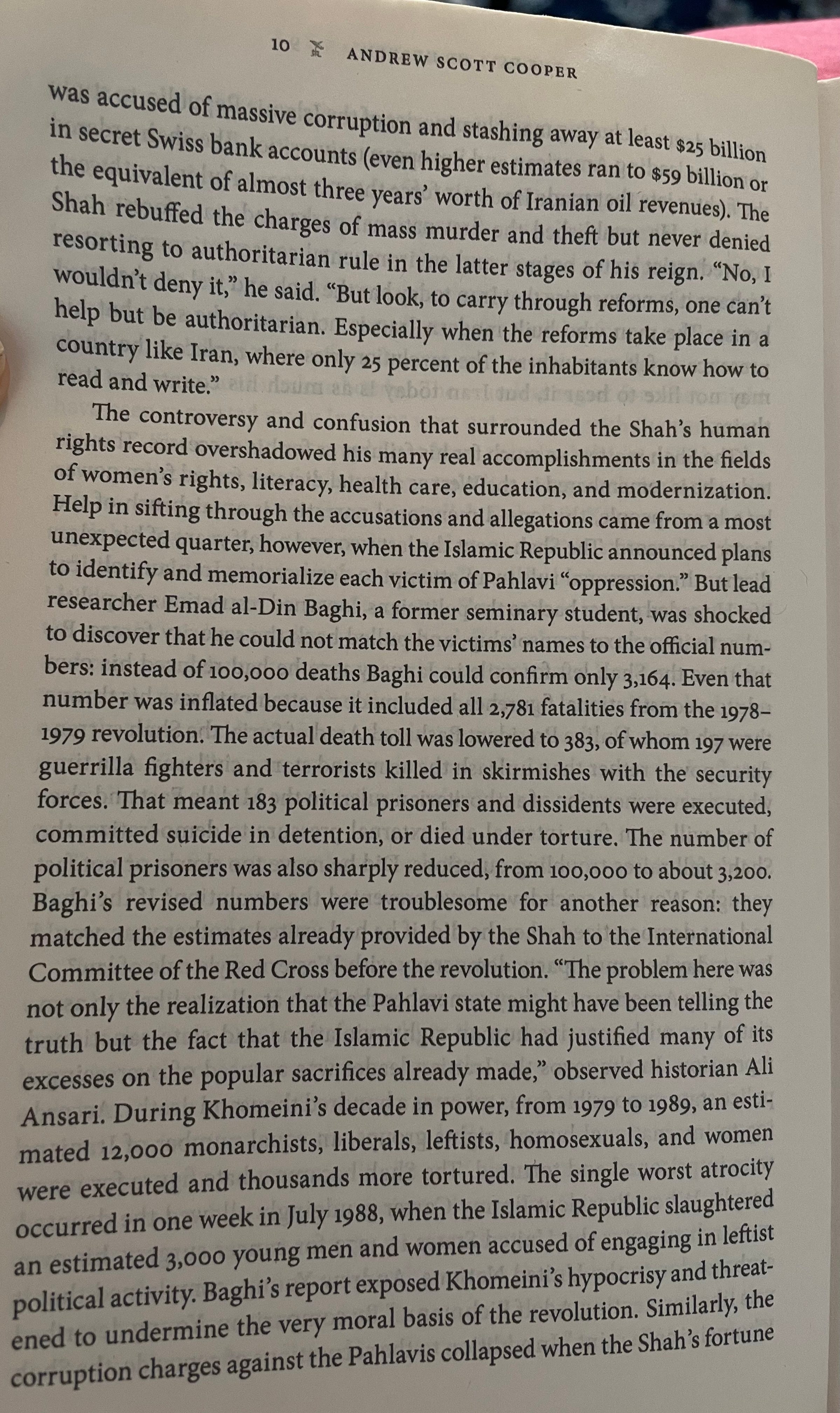 As Andrew Scott Cooper (former Human Rights Watch researcher) documents in The Fall of Heaven, the Shah was a flawed who enjoyed far more genuine popular support than the revolution’s TV cameras — focused only on large, angry crowds — ever revealed. His real legacy in women’s rights, literacy, health care, education, and modernization was overshadowed by propaganda that the Islamic