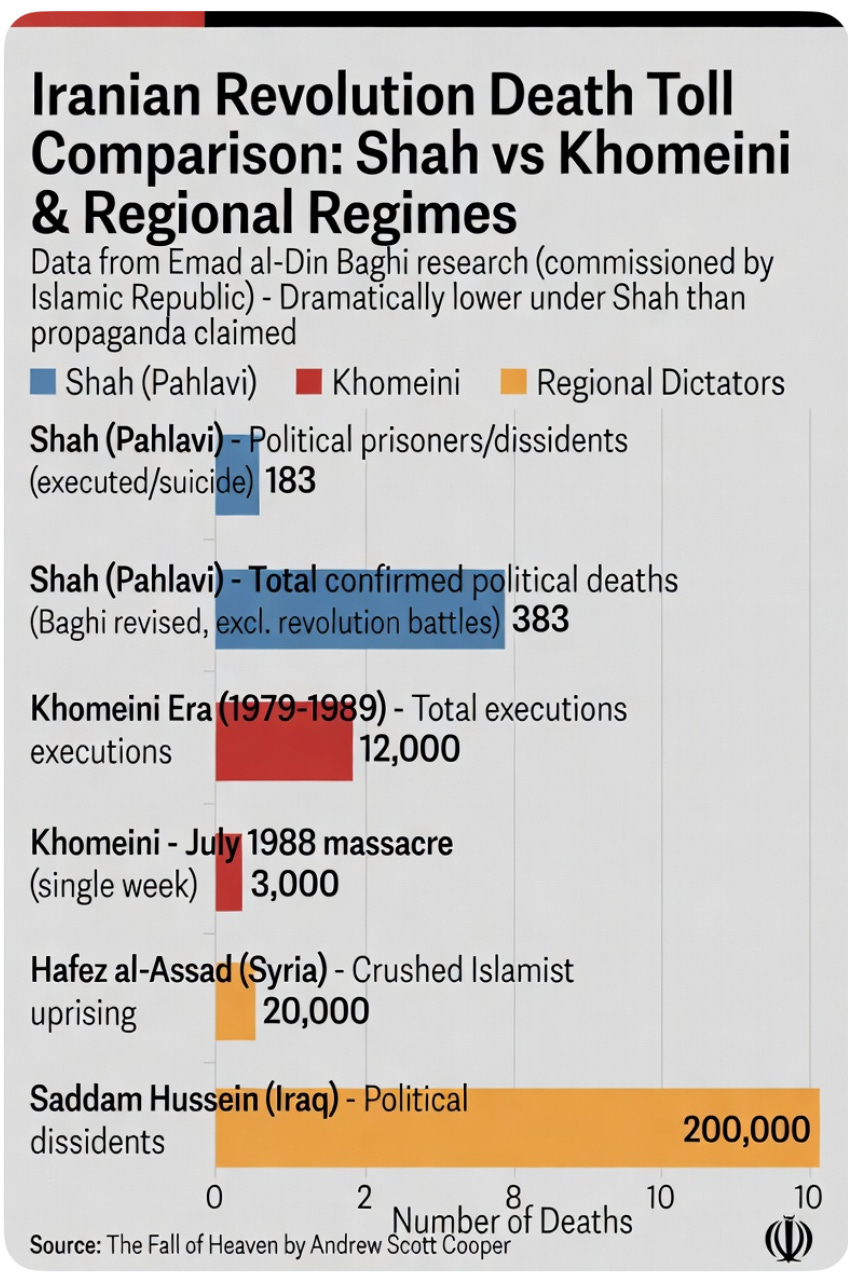 The exaggerated SAVAK narrative helped pave the way for the Islamic Republic, which quickly produced far higher death tolls — over 12,000 executions in its first four years alone — and reinstated harsher methods.