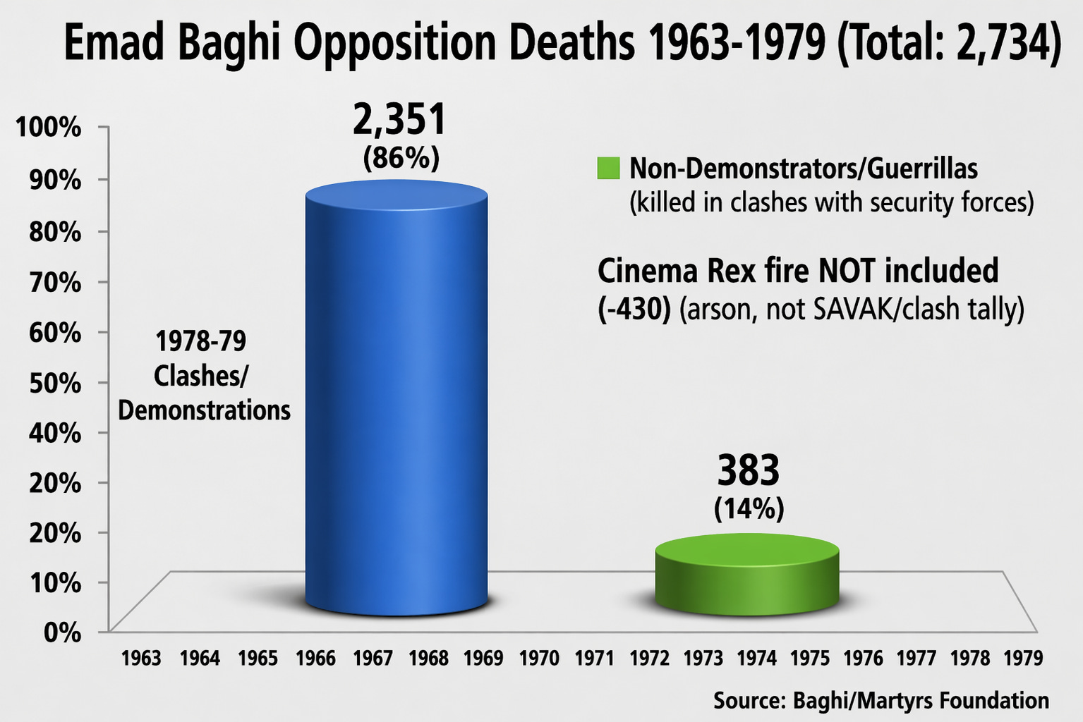 The Islamic Republic’s own research confirms the restraint. Emad Baghi, commissioned by the regime’s Martyrs Foundation (Bonyad Shahid), documented just **3,164 total deaths** from 1963 to 1979—not the 60,000 enshrined in Khomeini’s narrative and the constitution. Of these, **2,781 occurred during the 1978–79 revolutionary street clashes** with security forces. The remainder (~383, including armed guerrillas killed in confrontations or after trials) exposes the “60,000 martyrs” figure as inflated propaganda. When Baghi’s lower numbers emerged, the regime suppressed them.