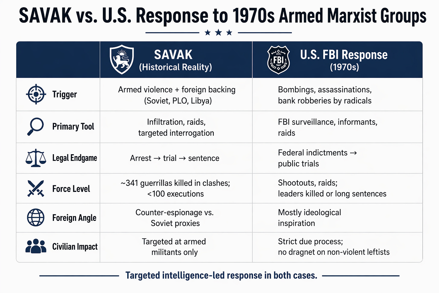When similar armed resistance—bombings, assassinations, and bank robberies—emerged in the United States during the 1970s (Weather Underground, Black Liberation Army, Symbionese Liberation Army), the American government responded with intelligence-led disruption: FBI infiltration, surveillance, raids, and federal prosecutions. Peaceful Marxist ideas remained protected speech, but violence triggered full suppression—mirroring SAVAK’s focus on armed actors while operating within stronger legal checks.