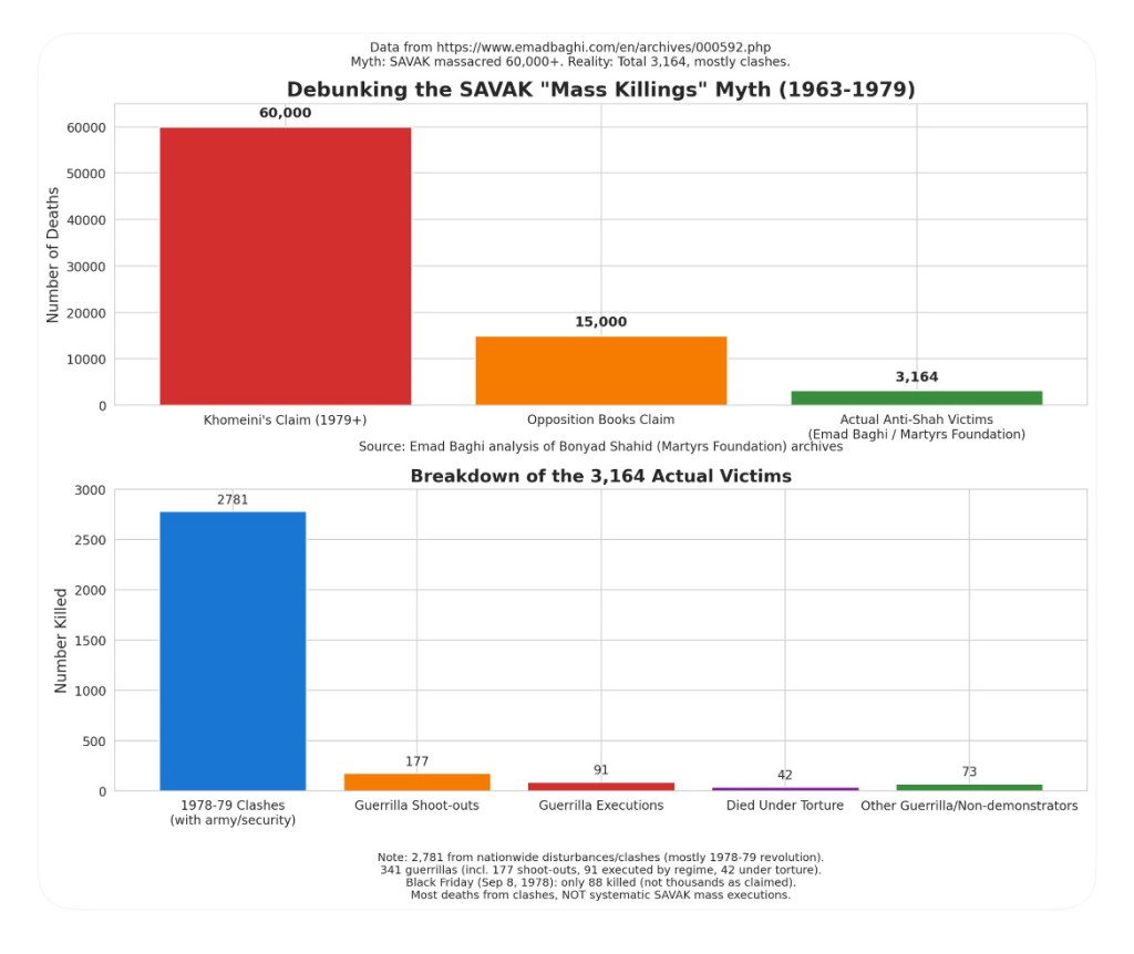 SAVAK’s actual record: The agency did not engage in mass executions or indiscriminate slaughter. The vast majority of deaths occurred in open revolutionary clashes in the final months, not in secret police death squads. The “60,000 massacred by SAVAK” story was propaganda that helped justify the Islamic Republic’s far greater death toll (the article notes hundreds of thousands killed in its first 24 years alone).
