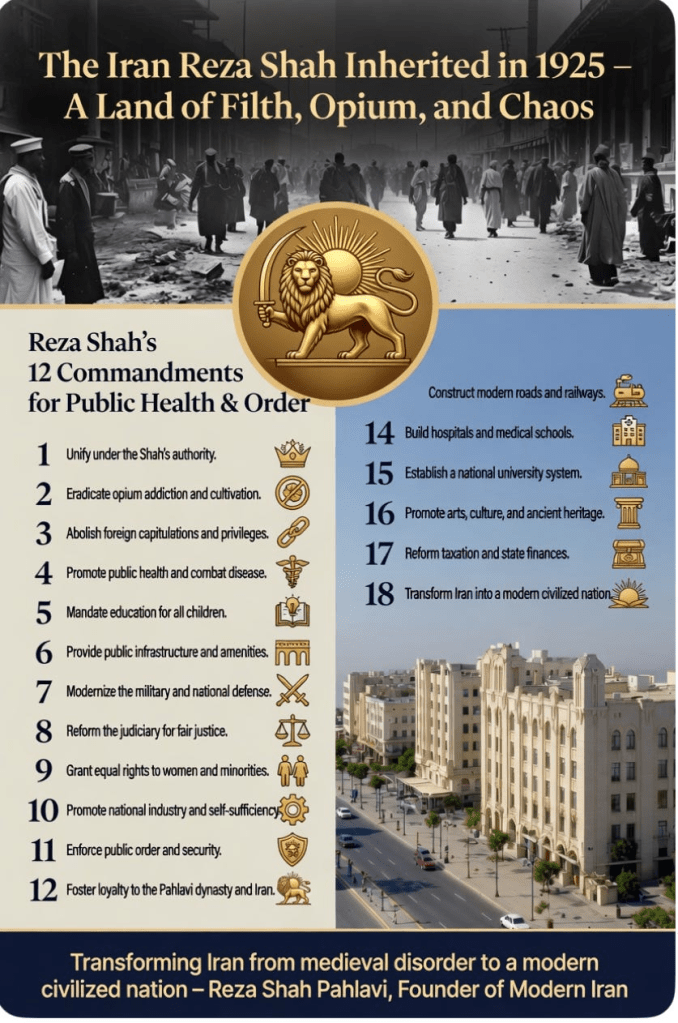 Reza Shah inherited a collapsing, backward country beset by filth, chaos, opium, tribal fragmentation, foreign interference—and violent religious resistance to basic reforms like the Khazineh Movement. From his improbable rise through the ranks and grueling campaigns like Khuzestan, he centralized power and launched sweeping modernization. The 12 Commandments addressed immediate urban disorder; oil renegotiations and the creation of Bank Melli (which took over note issuance from foreign hands) provided economic tools; infrastructure, education, military, and social changes—including women’s emancipation via unveiling and expanded rights, plus equality for religious minorities such as allowing Jewish schools to teach Hebrew without discrimination—built a cohesive nation-state. Through vision and resolve, he dragged Iran from medieval conditions into the 20th century—often against fierce opposition—laying institutions and infrastructure whose legacy shaped modern Iran.